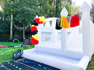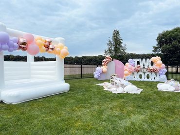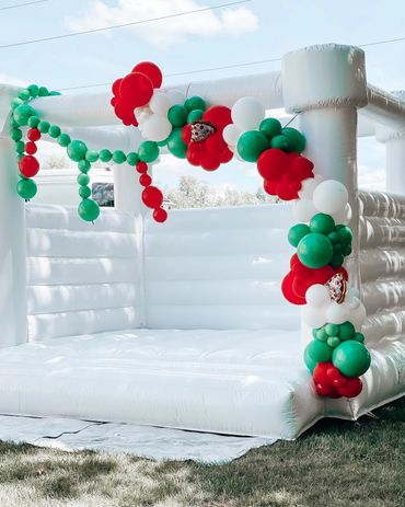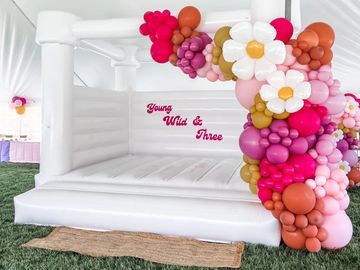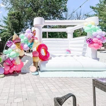 Rent our Modern White Bounce with optional decorative balloons. These balloons can match the theme colors of your party. Which will allow you to style your bounce house however you want with a beautiful balloon arch, flowers and greenery, a handmade banner, or holiday garland.
